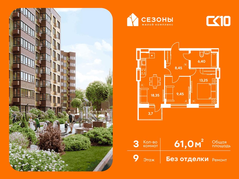 3-комнатная — 61,05 м² 9/25 эт. в Сезоны