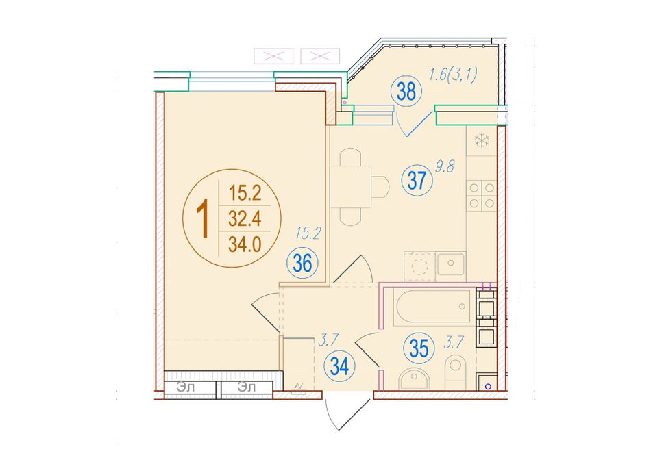 1-комнатная — 34 м² 3/9 эт. в Sport Village (Спортивная деревня)