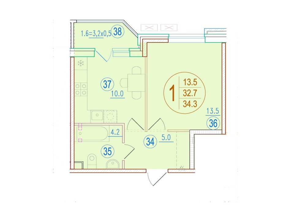 1-комнатная — 34,3 м² 1/9 эт. в Sport Village (Спортивная деревня)
