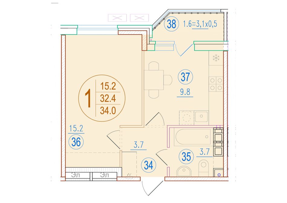 1-комнатная — 34 м² 4/9 эт. в Спортивная деревня