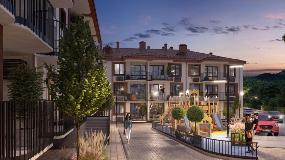 Малоэтажный жилой комплекс в Агое с панорамными видами на горы! Открытые балконы, большая ухоженная территория, парковка для автомобилей и коммерческие объекты на территории.