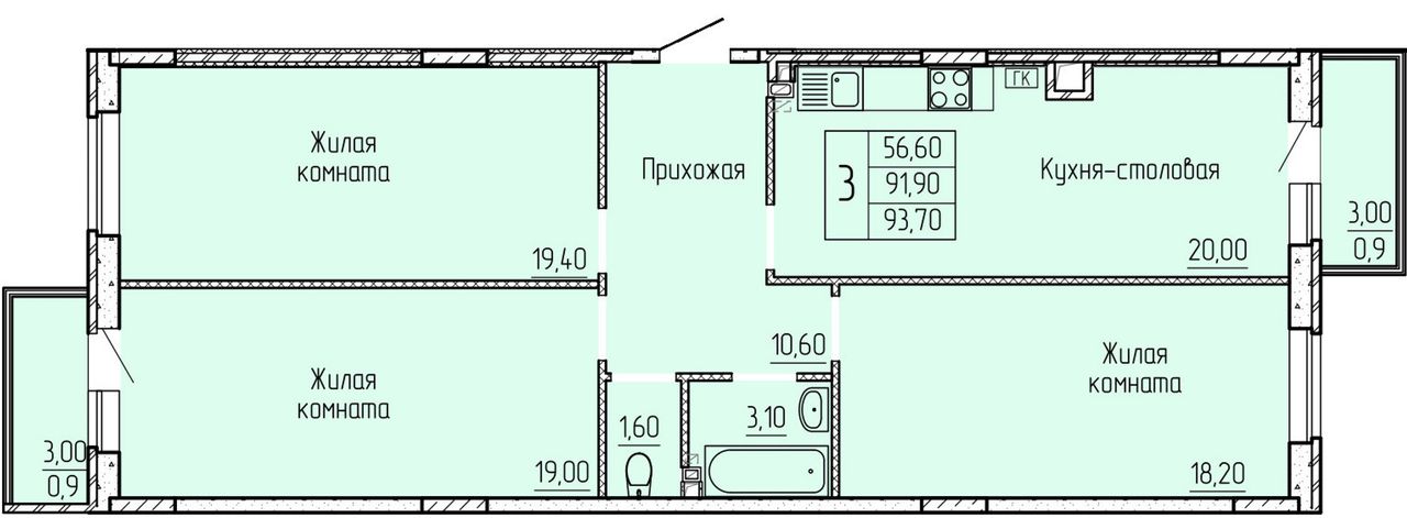 3-комнатная — 92,2 м² 3/4 эт. в Прибрежный