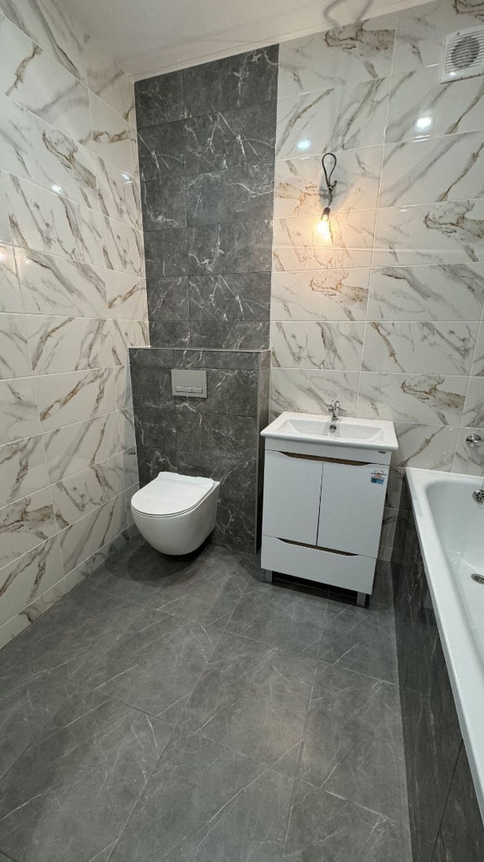 • в санузлах установлена сантехника - подвесной унитаз, ванна, раковина с тумбой, смесители.