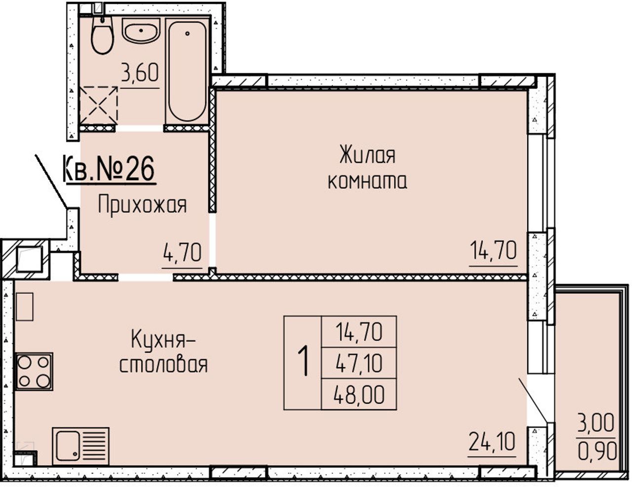 1-комнатная — 47,5 м² 1/4 эт. в Прибрежный