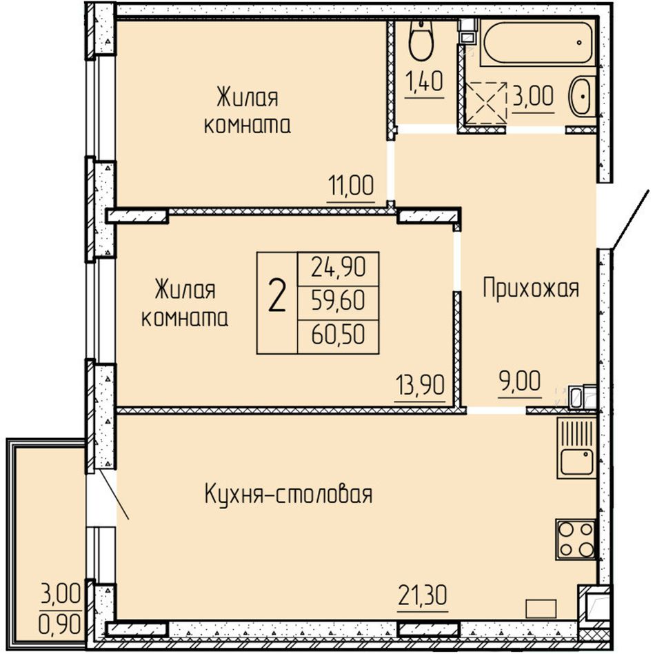 2-комнатная — 59,8 м² 4/4 эт. в Прибрежный