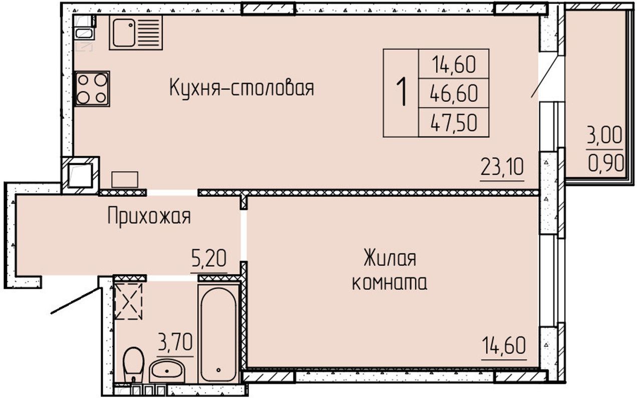 1-комнатная — 46,8 м² 4/4 эт. в Прибрежный