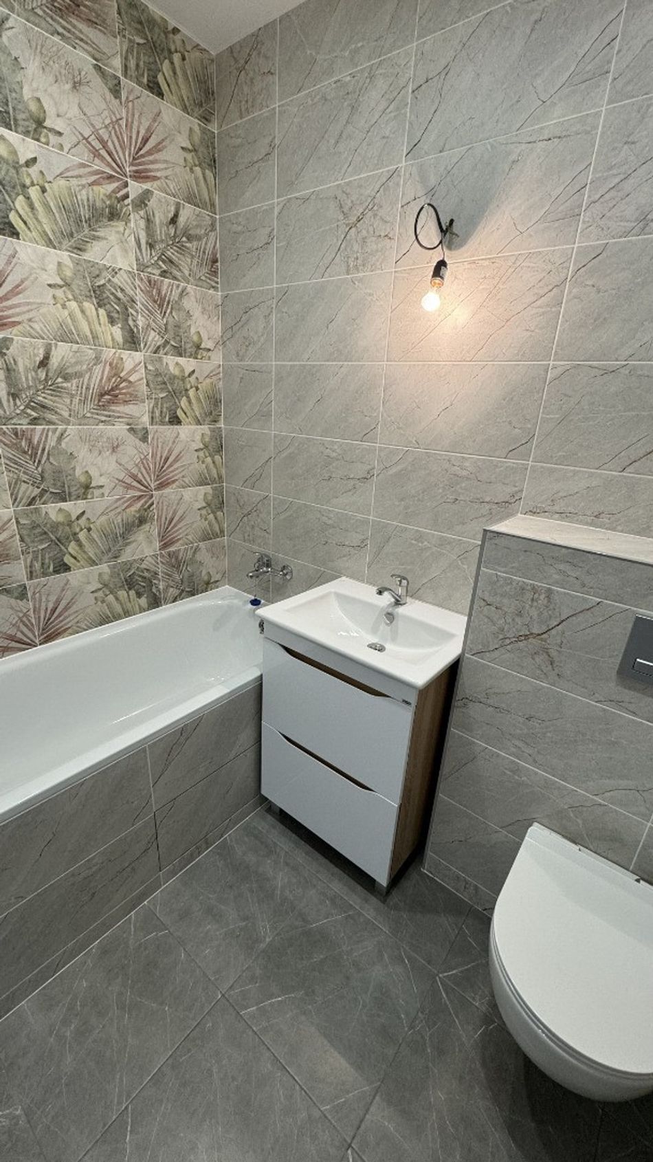 • в санузлах установлена сантехника - подвесной унитаз, ванна, раковина с тумбой, смесители.