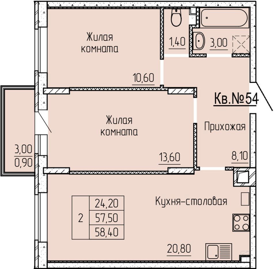 2-комнатная — 58,2 м² 1/4 эт. в Прибрежный