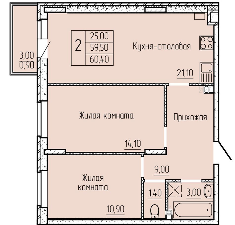 2-комнатная — 60,1 м² 2/4 эт. в Прибрежный