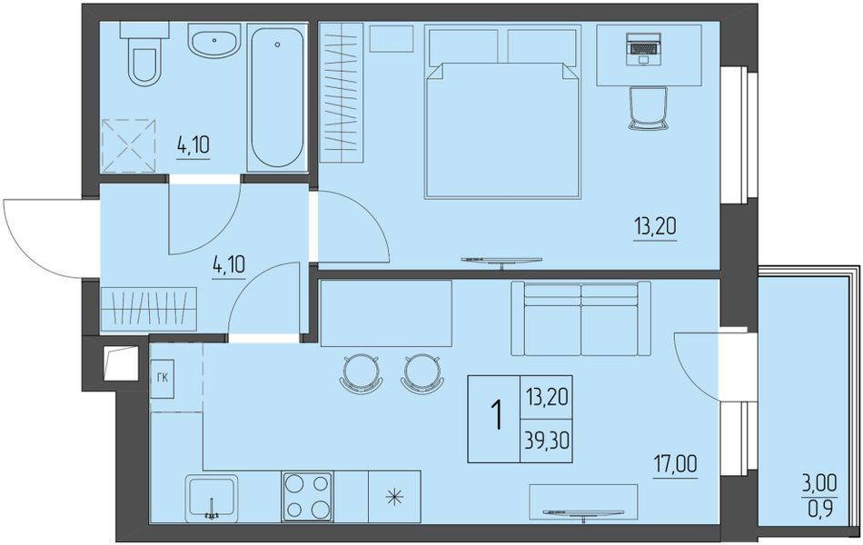 1-комнатная — 39,3 м² 2/4 эт. в Прибрежный