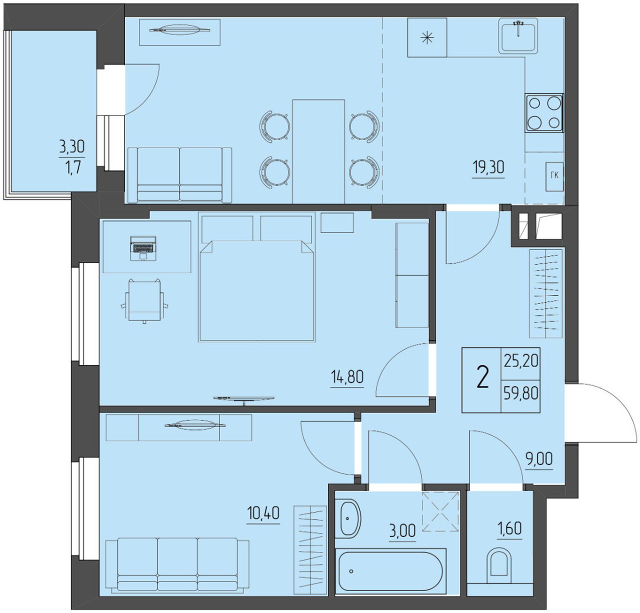 2-комнатная — 59,8 м² 2/4 эт. в Прибрежный