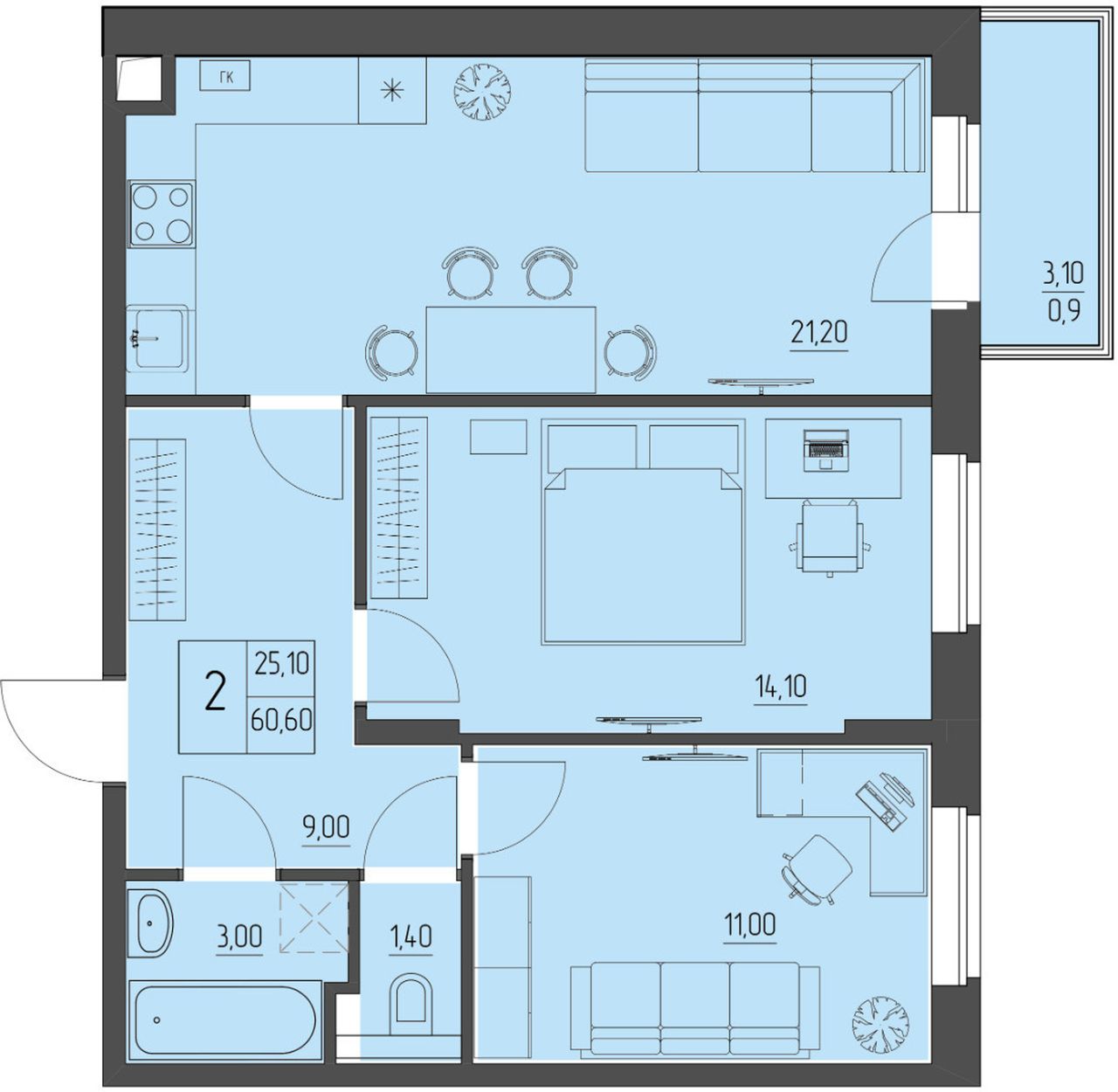 2-комнатная — 60,6 м² 2/4 эт. в Прибрежный