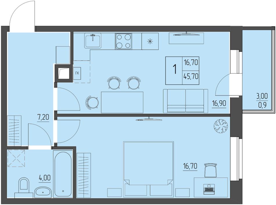 1-комнатная — 45,7 м² 3/4 эт. в Прибрежный