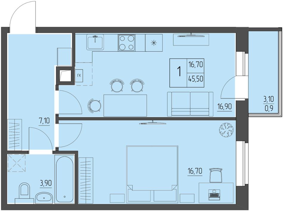 1-комнатная — 45,5 м² 4/4 эт. в Прибрежный