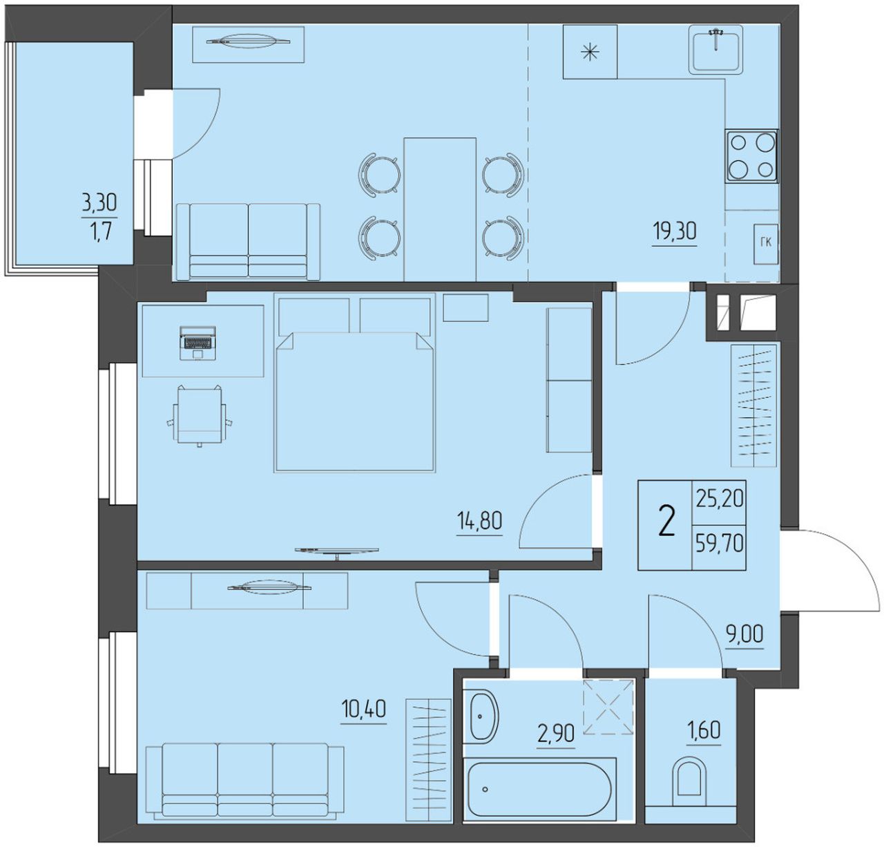 2-комнатная — 59,7 м² 4/4 эт. в Прибрежный