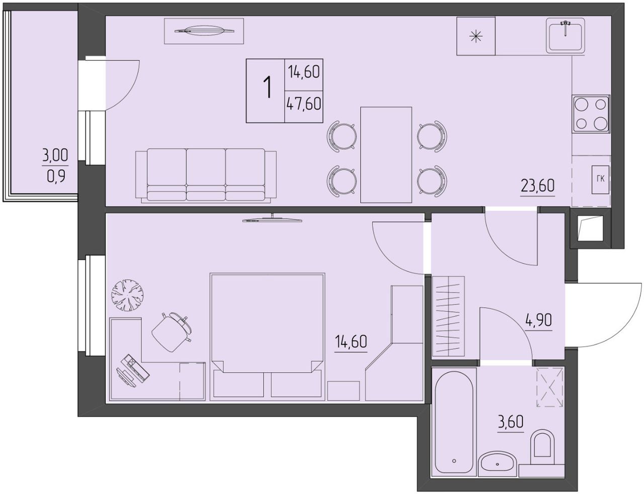 1-комнатная — 47,6 м² 1/4 эт. в Прибрежный
