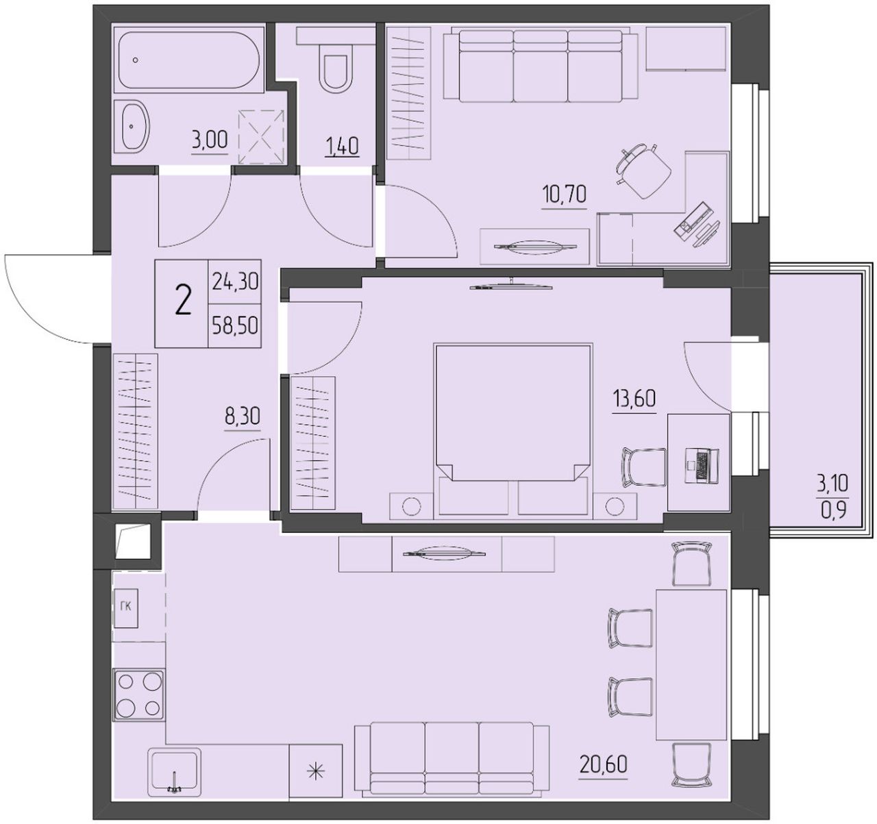 2-комнатная — 58,5 м² 1/4 эт. в Прибрежный