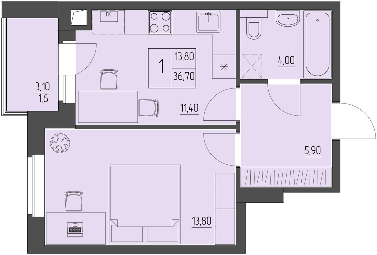 • кухонный гарнитур, включая технику (по желанию, дополнительная опция);