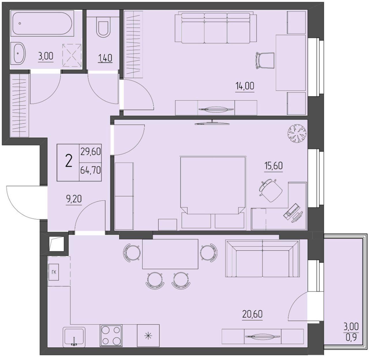 2-комнатная — 64,7 м² 3/4 эт. в Прибрежный
