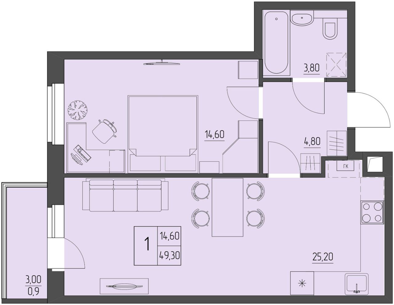 1-комнатная — 49,3 м² 3/4 эт. в Прибрежный