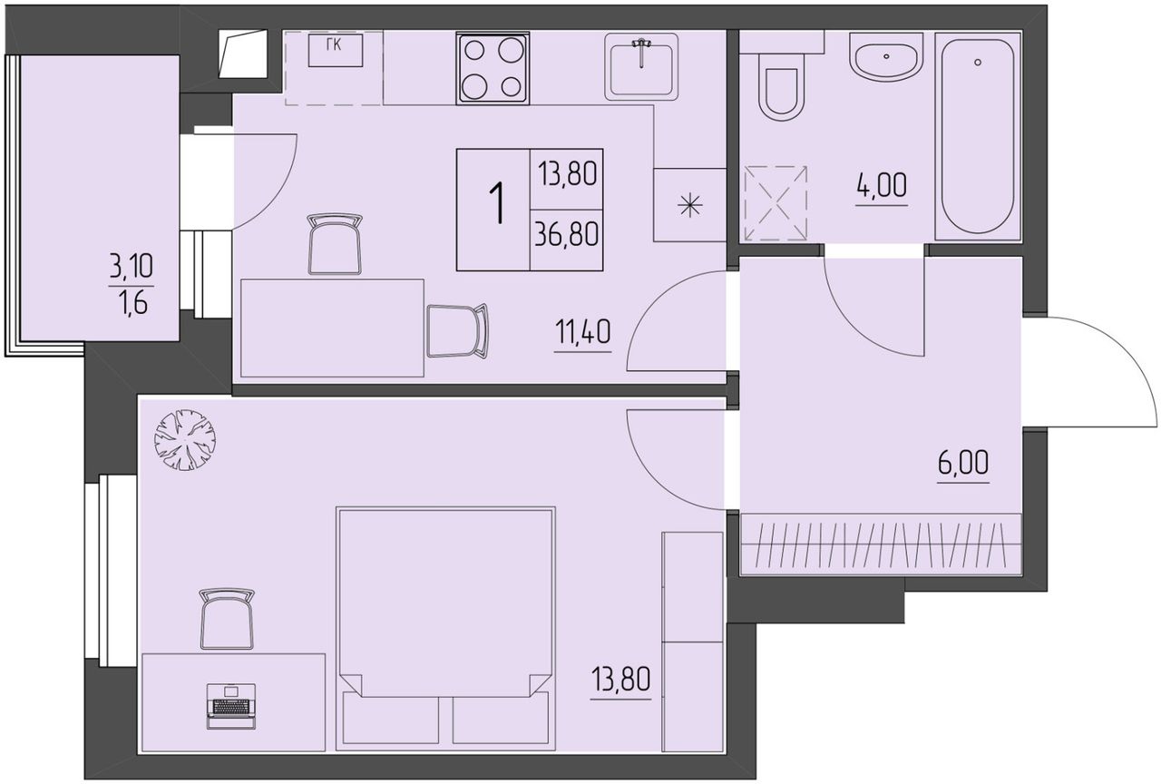 1-комнатная — 36,8 м² 3/4 эт. в Прибрежный