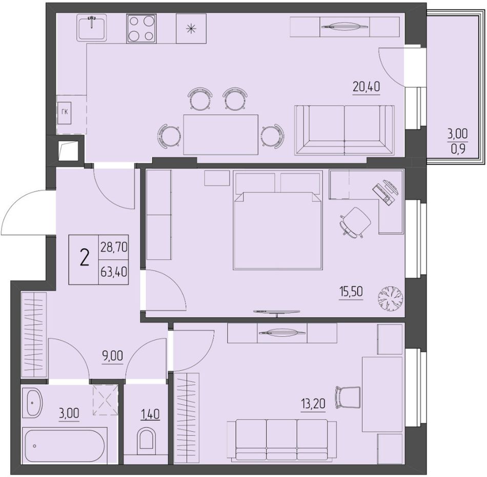 2-комнатная — 63,4 м² 4/4 эт. в Прибрежный