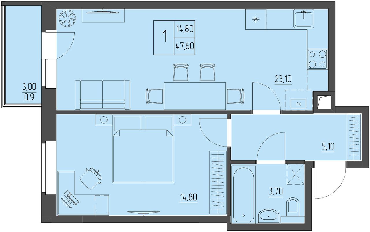 1-комнатная — 47,6 м² 3/4 эт. в Прибрежный