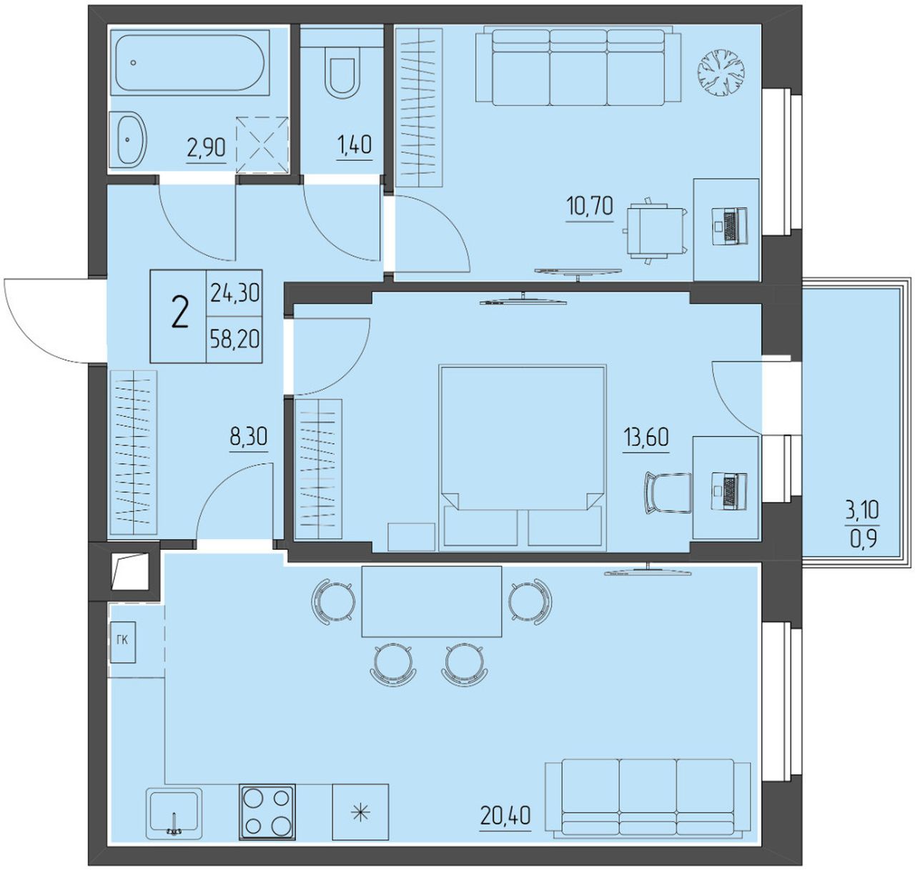2-комнатная — 58,2 м² 4/4 эт. в Прибрежный