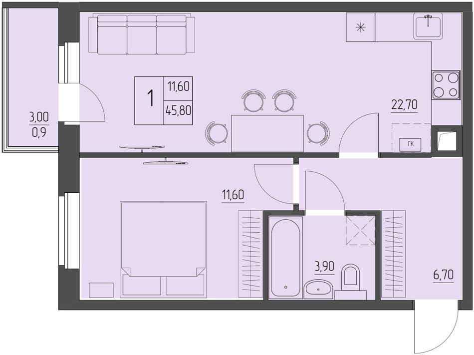 1-комнатная — 45,8 м² 2/4 эт. в Прибрежный