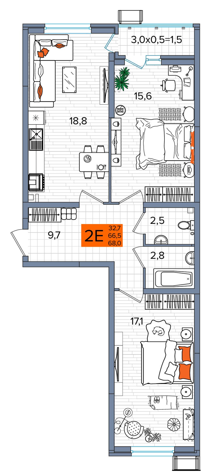 Эргономичная 2-комнатная квартира площадью 68 кв.м. на 2 этаже в подъезде №1 с видом на двор - это оптимальный выбор для тех, кто ценит уют, качество и современный комфорт.