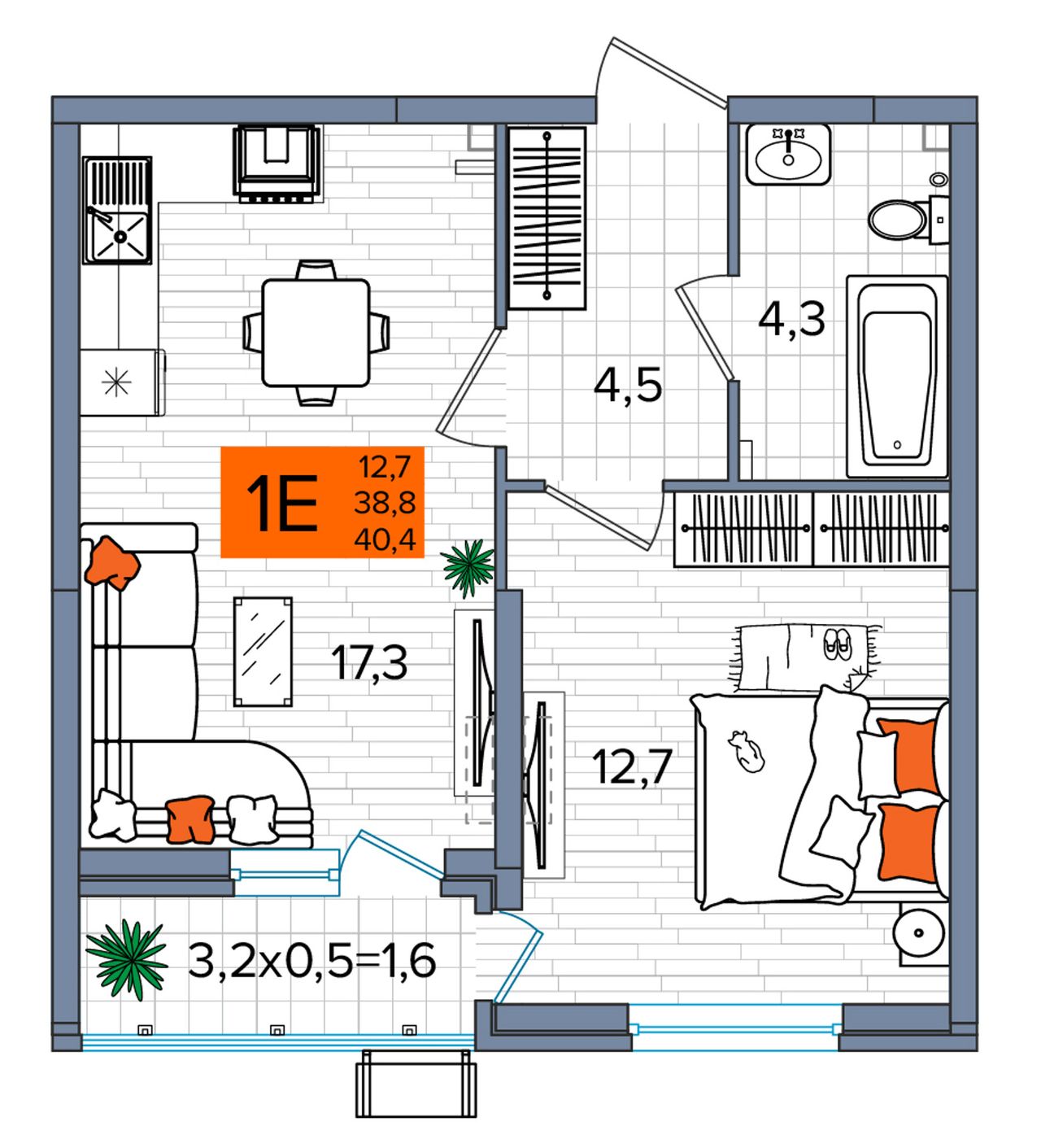 1-комнатная — 40,4 м² 2/16 эт. в Сармат