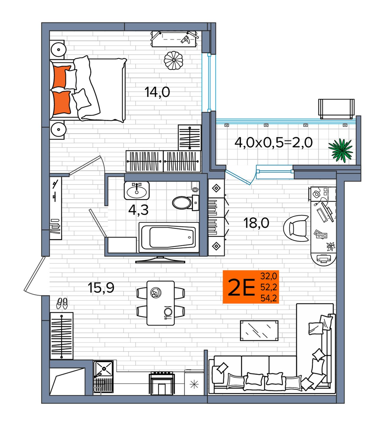 2-комнатная — 54,2 м² 2/16 эт. в Сармат