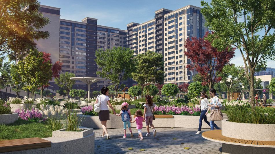 Единый европейский стиль фасадов, благоустроенная территория, собственный детский садик и школа, ландшафтное озеленение, подземный и многоуровневый паркинг для автомобилей.