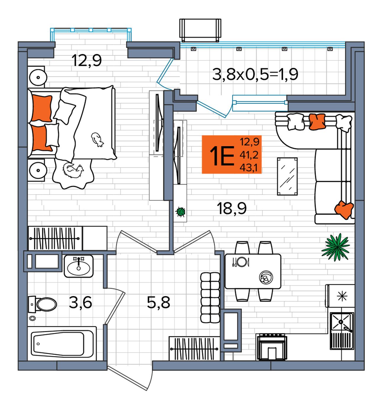 1-комнатная — 43,1 м² 15/16 эт. в Сармат