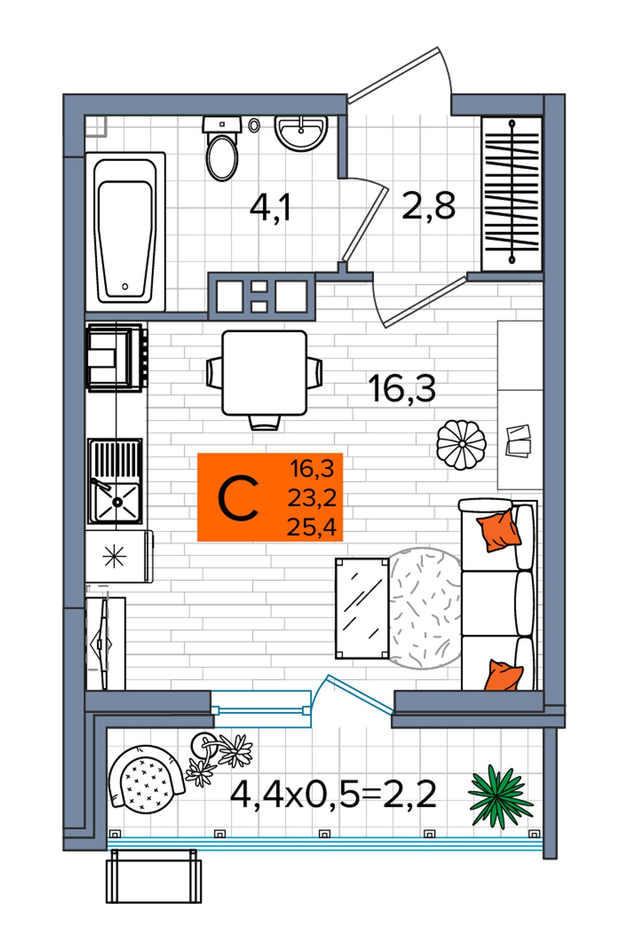 Студия — 25,4 м² 5/16 эт. в Сармат