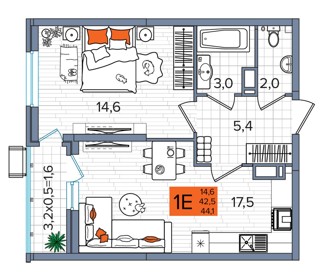 1-комнатная — 44,1 м² 16/16 эт. в Сармат