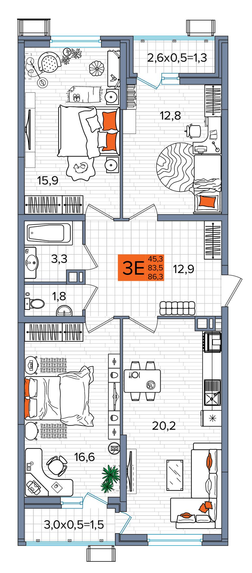 3-комнатная — 86,3 м² 3/16 эт. в Сармат
