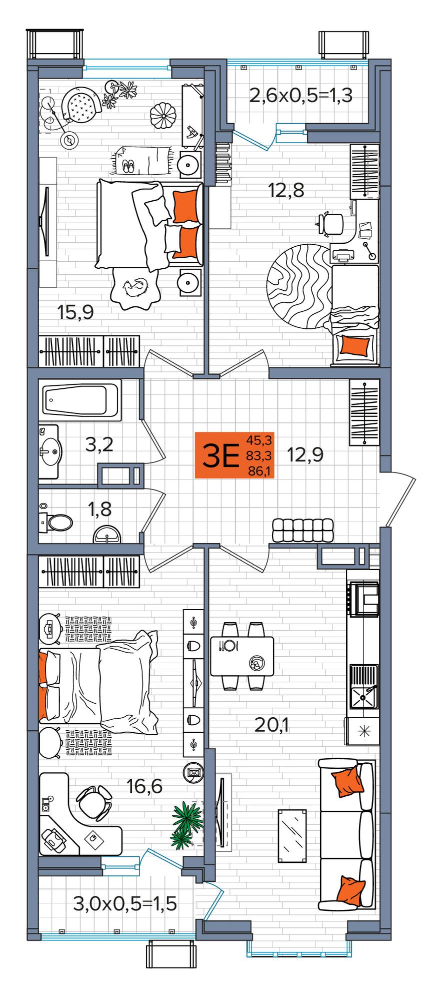 3-комнатная — 86,1 м² 16/16 эт. в Сармат