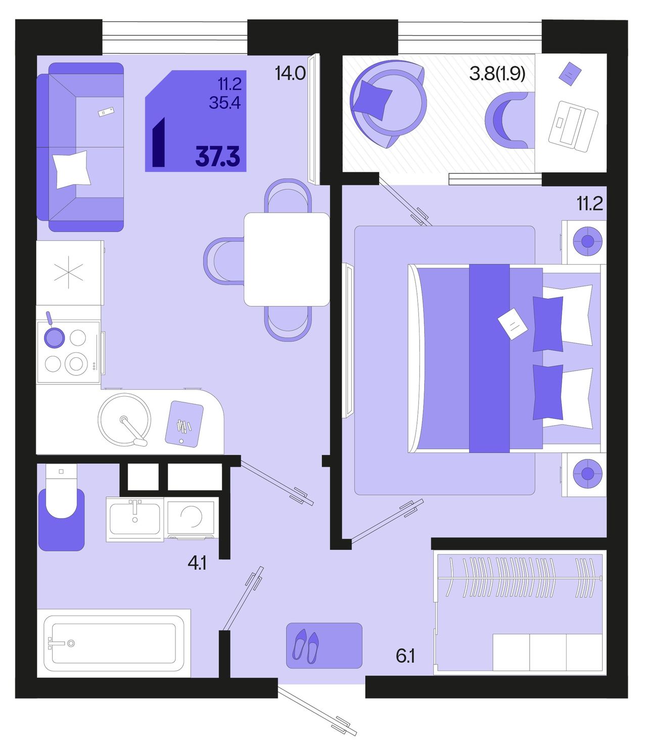 1-комнатная — 37,3 м² 4/18 эт. в Первое место