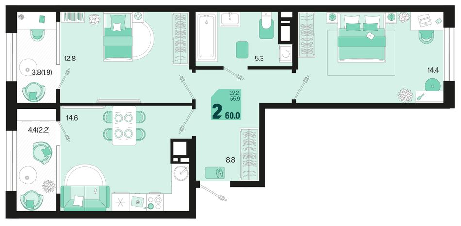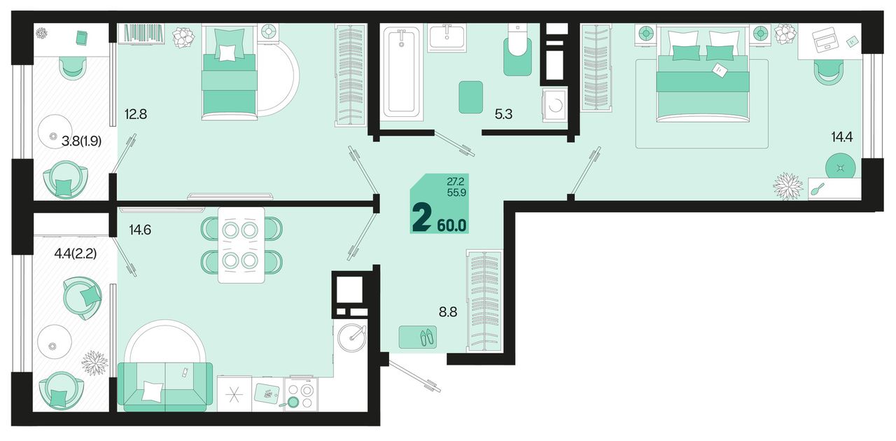 2-комнатная — 60 м² 8/18 эт. в Первое место