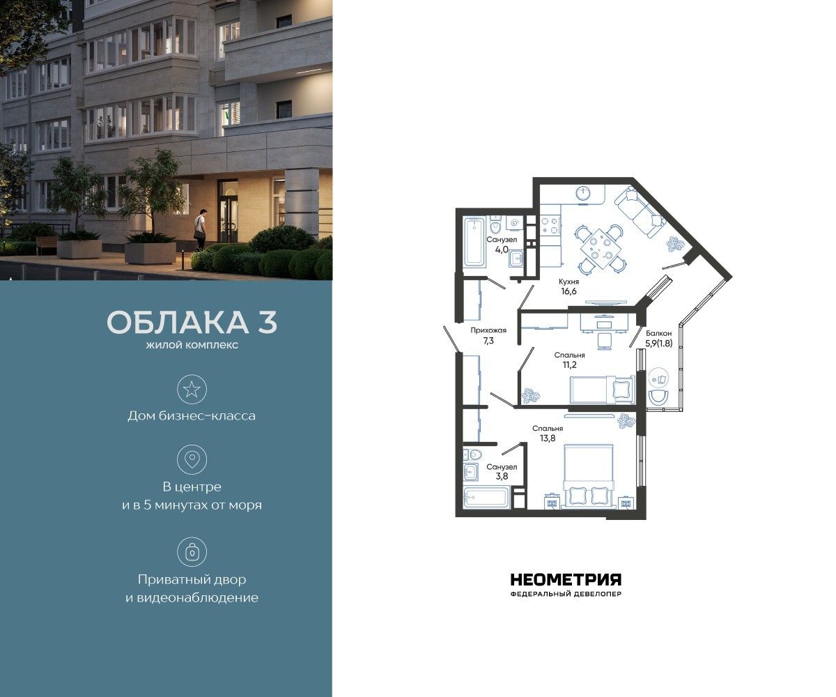 Продается квартира в жилом комплексе «Облака» от федерального девелопера «Неометрия».
