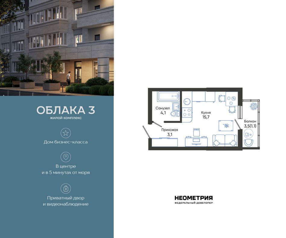 Продается квартира в жилом комплексе «Облака» от федерального девелопера «Неометрия».