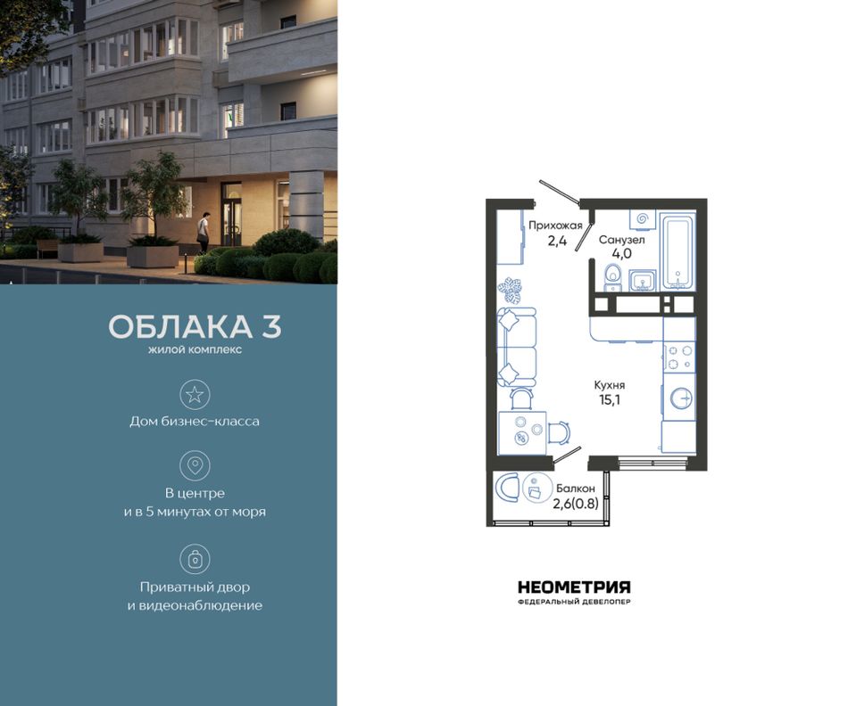 Продается квартира в жилом комплексе «Облака» от федерального девелопера «Неометрия».
