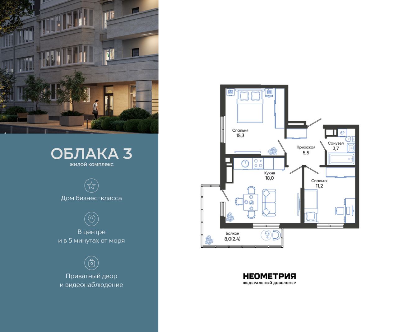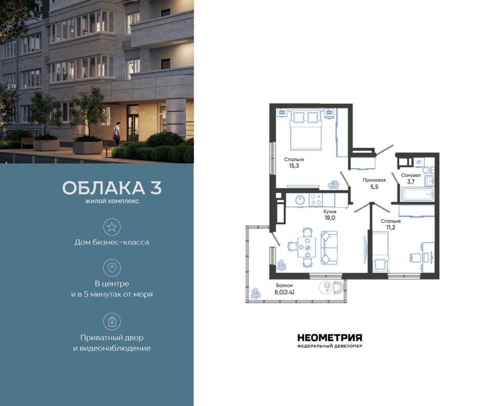 Продается квартира в жилом комплексе «Облака» от федерального девелопера «Неометрия».