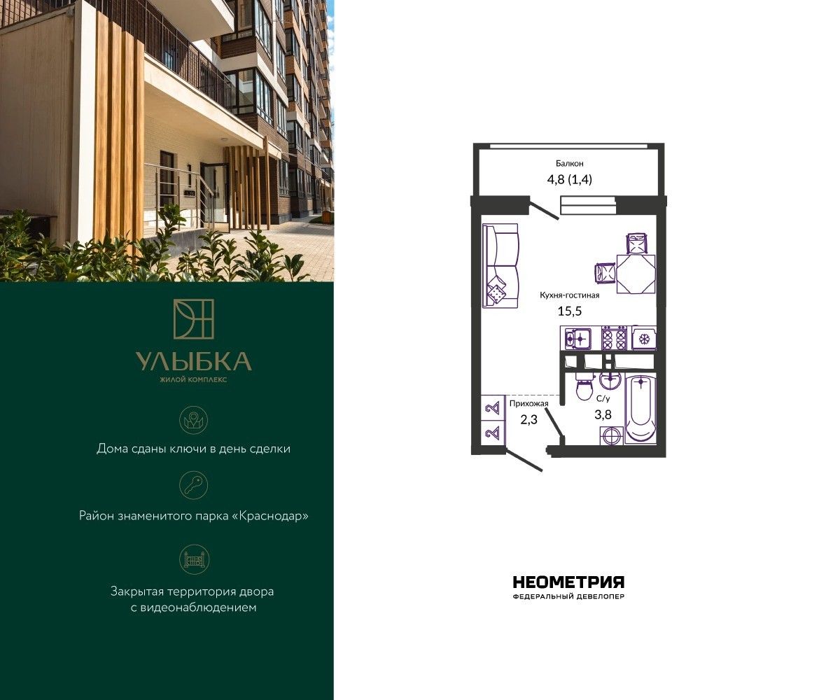 Продается квартира в жилом комплексе «Улыбка» от федерального девелопера «Неометрия». Все дома сданы, ключи в день сделки.