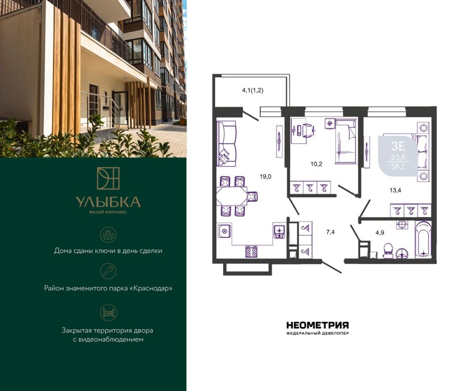 Продается квартира в жилом комплексе «Улыбка» от федерального девелопера «Неометрия». Все дома сданы, ключи в день сделки.