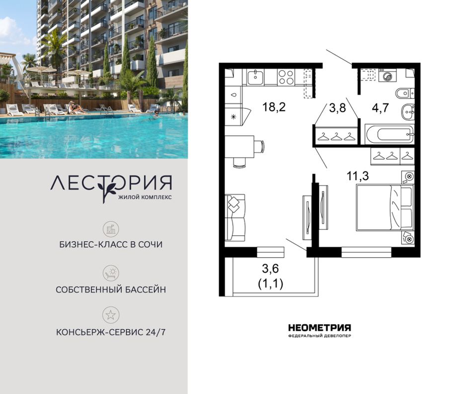 Продается квартира в жилом комплексе бизнес-класса «Лестория». В составе ЖК предусмотрена собственная аквазона площадью 473 квадратных метра с двумя подогреваемыми бассейнами, что соответствуют стандартам бизнес-класса.