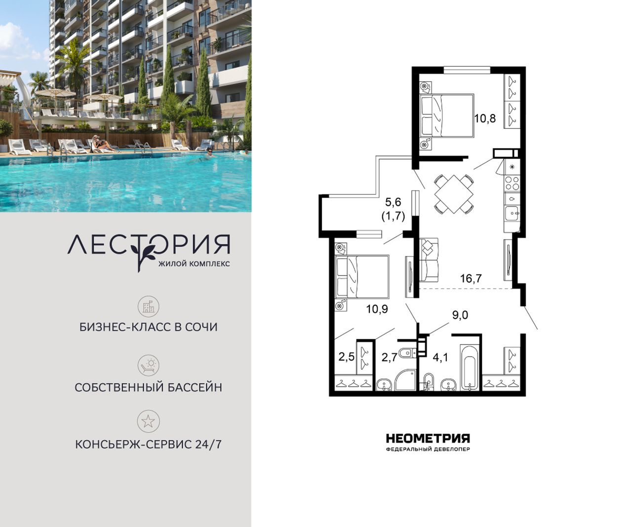 Продается квартира в жилом комплексе бизнес-класса «Лестория». В составе ЖК предусмотрена собственная аквазона площадью 473 квадратных метра с двумя подогреваемыми бассейнами, что соответствуют стандартам бизнес-класса.