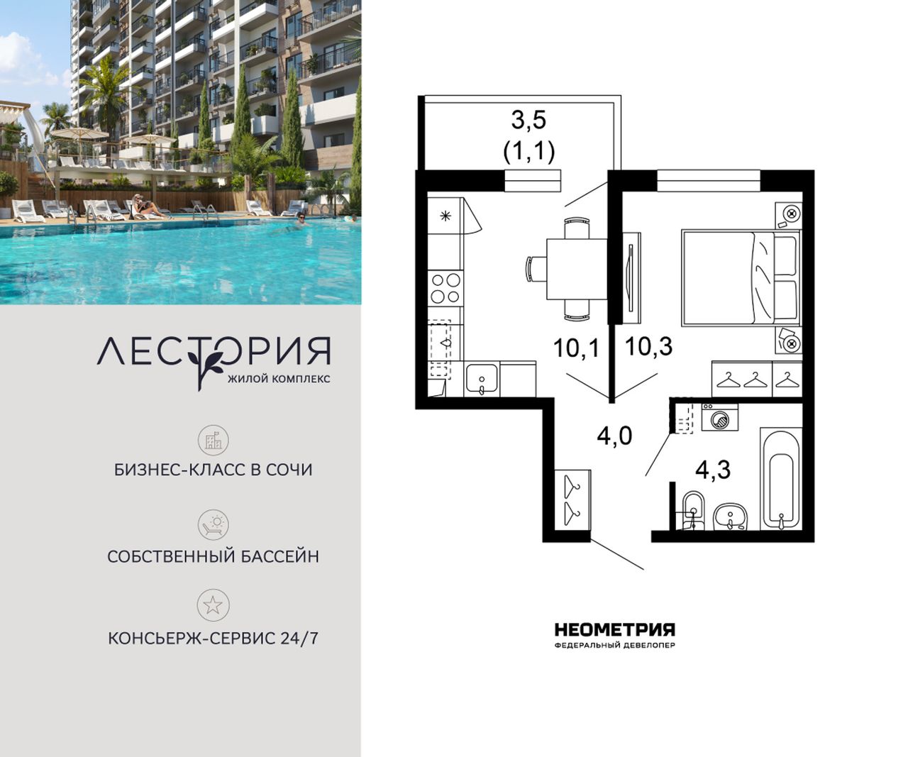 Продается квартира в жилом комплексе бизнес-класса «Лестория». В составе ЖК предусмотрена собственная аквазона площадью 473 квадратных метра с двумя подогреваемыми бассейнами, что соответствуют стандартам бизнес-класса.