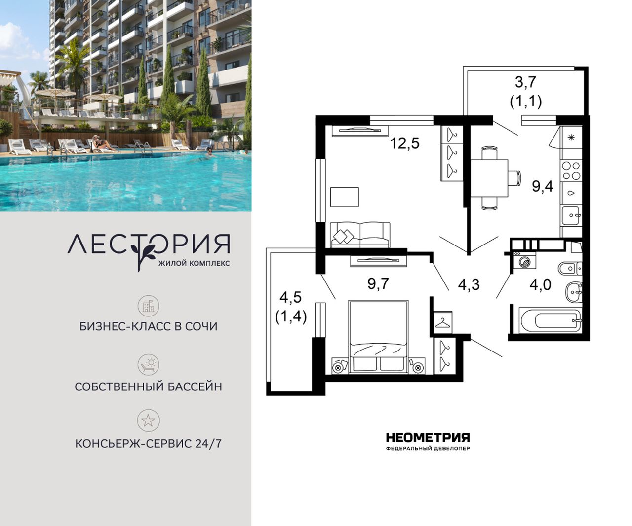 Продается квартира в жилом комплексе бизнес-класса «Лестория». В составе ЖК предусмотрена собственная аквазона площадью 473 квадратных метра с двумя подогреваемыми бассейнами, что соответствуют стандартам бизнес-класса.